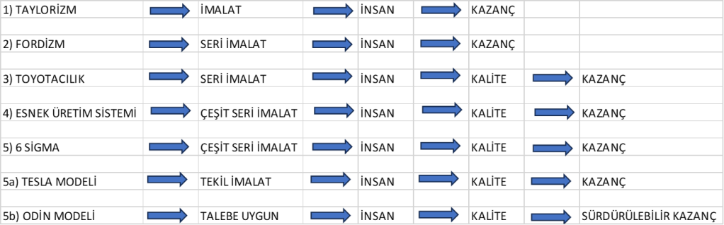 - Taylorizm ve Fordizm, daha hierarşik ve işçiye dayatılan bir yapıyı yansıtırken, Toyotacılık ve Esnek Üretim Sistemleri, işçi katılımını ve sürekli iyileştirmeyi teşvik eder.
