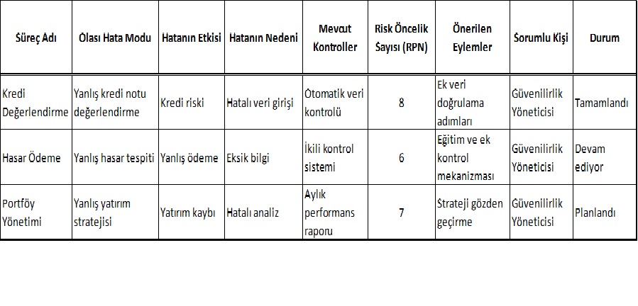 Bir bankanın kredi riskini yönetmek için FMEA’yı kullanması, sürecin daha güvenli ve verimli hale getirilmesine katkı sağlar. Banka, kredi başvurusu sürecindeki olası hata modlarını (örneğin, yanlış kredi notu değerlendirmesi) belirler ve bu hataların nedenlerini analiz eder. FMEA kullanılarak, kredi değerlendirme süreçleri sürekli olarak izlenir ve iyileştirilir. Bu, kredi riskinin minimize edilmesini ve müşteri memnuniyetinin artırılmasını sağlar. Bugün bankalar artık risk yöneticisi arıyorlar. Keşke riskleri yönetebilen, güvenilirlik mühendisleri yetiştirseydik diyeceğiniz noktaya sadece bir adım kaldı.