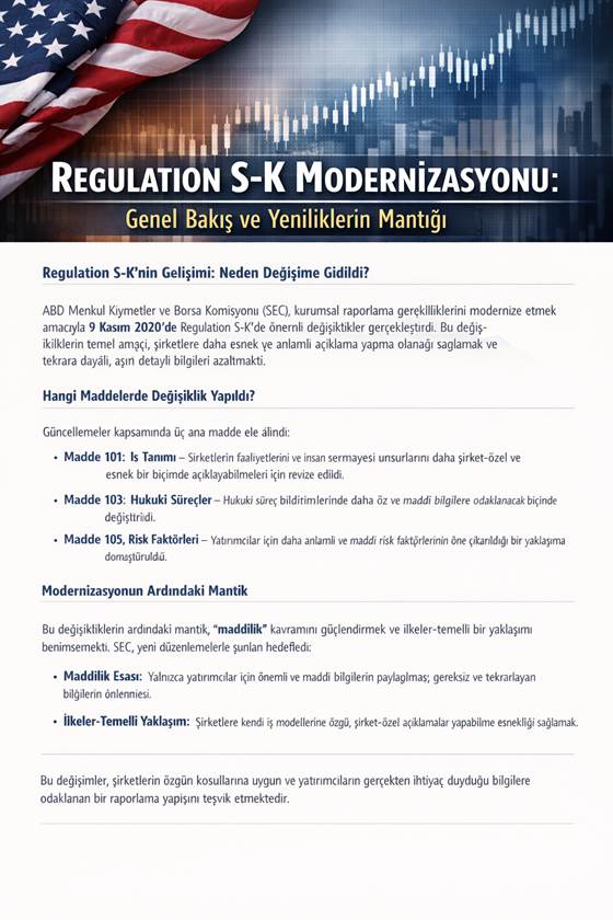 SEC (U.S. Securities and Exchange Commission) 2019’da somut adımı attı ve Regulation S-K’de değişiklik önerilerini yayımladı. Amaç aslında oldukça basitti: gereksiz detayları azaltmak ve gerçekten önemli bilgiyi öne çıkarmak. Bir yıl sonra, 2020’de nihai kural kabul edildi ve kasım ayında yürürlüğe girdi. Bu güncelleme, son 30 yılın en büyük değişimi olarak dikkat çekti.